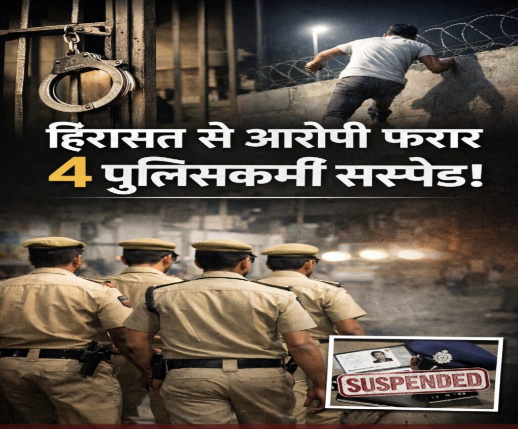 सक्ती। छत्तीसगढ़ के सक्ती जिले में पुलिस हिरासत से आरोपी के फरार होने के मामले में एसपी प्रफुल्ल कुमार ठाकुर ने बड़ी कार्रवाई करते हुए चार पुलिसकर्मियों को निलंबित कर दिया है। इस घटना ने पुलिस विभाग की कार्यप्रणाली पर सवाल खड़े कर दिए हैं।