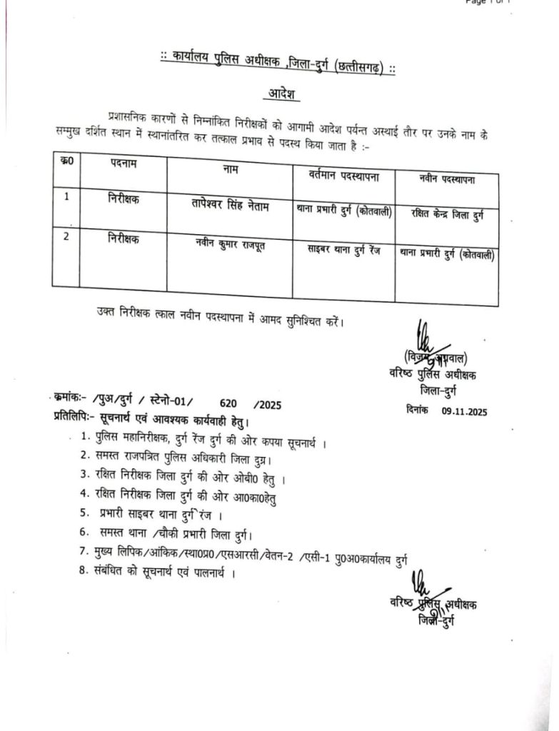 लगातार बढ़ते अपराध और पुलिस की लापरवाही पर सवाल उठते देख एसएसपी दुर्ग ने बड़ी कार्रवाई की है। कोतवाली थाना प्रभारी तपेश्वर नेताम को तत्काल प्रभाव से लाइन अटैच कर दिया गया है। उनकी जगह नवीन कुमार को नया थाना प्रभारी नियुक्त किया गया है। एसएसपी ने कहा है कि जिले में कानून व्यवस्था को बिगाड़ने वालों के खिलाफ सख्त कदम उठाए जाएंगे और किसी भी स्तर पर लापरवाही बर्दाश्त नहीं की जाएगी।