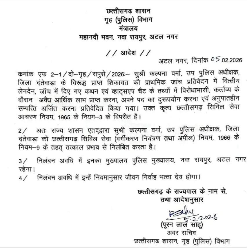 रायपुर। छत्तीसगढ़ के रायपुर से एक अहम प्रशासनिक खबर सामने आई है। राज्य सरकार ने गंभीर आरोपों के मद्देनज़र डीएसपी कल्पना वर्मा को तत्काल प्रभाव से निलंबित कर दिया है। इस कार्रवाई के बाद पुलिस महकमे में हलचल तेज हो गई है।
