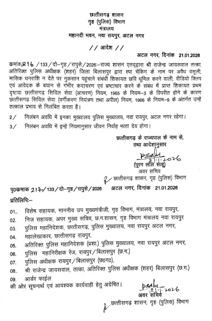जारी आदेश में कहा गया है कि ये कृत्य छत्तीसगढ़ सिविल सेवा (आचरण) नियम, 1965 के नियम-3 के विपरीत पाए गए हैं। इसके चलते छत्तीसगढ़ सिविल सेवा (वर्गीकरण, नियंत्रण तथा अपील) नियम, 1966 के नियम-9 के तहत एएसपी राजेंद्र जायसवाल को निलंबित किया गया है।