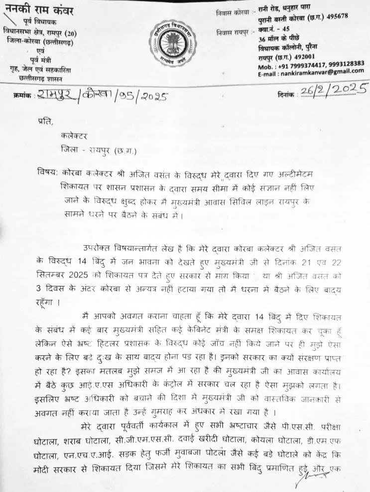 रायपुर। छत्तीसगढ़ की राजनीति में एक बार फिर बड़ा संग्राम खड़ा होने जा रहा है। पूर्व गृहमंत्री और भाजपा के वरिष्ठ नेता ननकीराम कंवर ने स्पष्ट ऐलान कर दिया है कि वे 4 अक्टूबर को मुख्यमंत्री निवास के सामने धरना देंगे। उनका यह विरोध प्रदर्शन कोरबा कलेक्टर अजीत वसंत को हटाने की मांग को लेकर होगा। इस संबंध में उन्होंने रायपुर कलेक्टर गौरव सिंह को पत्र लिखकर धरने की अनुमति भी मांगी है।