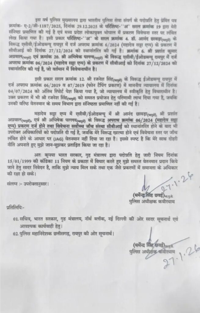 कवर्धा एसपी धर्मेंद्र सिंह ने पत्र में लिखा है कि वे 2012 बैच के आईपीएस अधिकारी हैं और अब तक उन्हें जूनियर स्केल और सीनियर स्केल का प्रमोशन तक नहीं दिया गया है। उन्होंने कहा कि उनके ही बैच के कई अधिकारी डीआईजी जैसे वरिष्ठ पद पर पहुंच चुके हैं, लेकिन उन्हें नजरअंदाज किया गया।