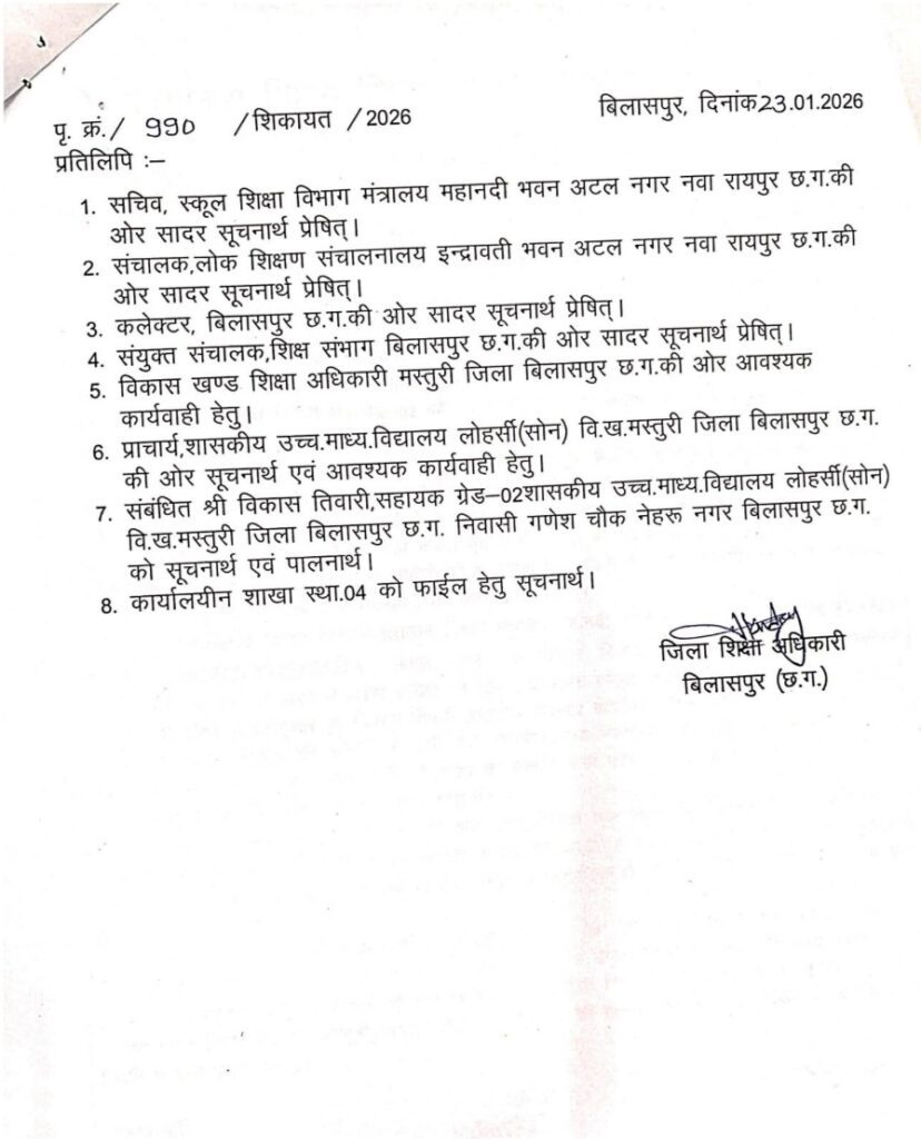 जानकारी के मुताबिक, विकास तिवारी का प्रशासनिक तबादला शासकीय उच्चतर माध्यमिक विद्यालय लोहर्सी (सोन), विकासखंड मस्तुरी में किया गया था। यह आदेश कलेक्टर बिलासपुर और छत्तीसगढ़ शासन सामान्य प्रशासन विभाग के निर्देशों के अनुरूप जारी हुआ था। 1 जुलाई 2025 को उन्हें जिला शिक्षा अधिकारी कार्यालय से विधिवत कार्यमुक्त भी कर दिया गया था, ताकि वे नई पदस्थापना स्थल पर कार्यभार ग्रहण कर सकें।