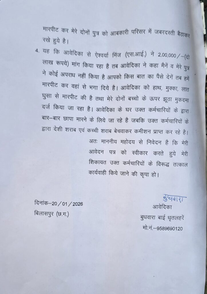 बिलासपुर। छत्तीसगढ़ के बिलासपुर जिले के मस्तूरी थाना क्षेत्र अंतर्गत ग्राम कुटेला की एक महिला ने आबकारी विभाग के एक सब-इंस्पेक्टर और उनकी टीम पर गंभीर आरोप लगाए हैं। महिला ने कलेक्टर और पुलिस अधीक्षक को लिखित शिकायत सौंपते हुए न्याय की गुहार लगाई है।