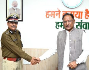 रायपुर। मुख्यमंत्री विष्णुदेव साय से आज उनके निवास कार्यालय में नवनियुक्त पुलिस महानिदेशक अरुण देव गौतम ने सौजन्य भेंट की। मुख्यमंत्री विष्णुदेव साय ने गौतम को नई जिम्मेदारी के लिए शुभकामनाएं देते हुए प्रदेश में कानून-व्यवस्था, अपराध नियंत्रण, नागरिक सुरक्षा और पुलिस प्रशासन को और अधिक प्रभावी बनाने हेतु आवश्यक दिशा-निर्देश प्रदान किए। उन्होंने आधुनिक तकनीकों के समुचित उपयोग, जनसहभागिता और अनुशासित पुलिसिंग के माध्यम से प्रदेश में कानून-व्यवस्था को सुदृढ़ किए जाने पर बल दिया।