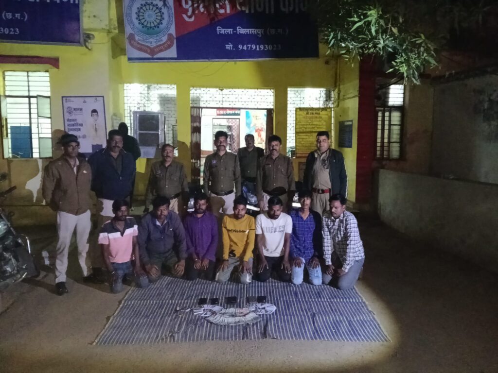 बिलासपुर। छत्तीसगढ़ के बिलासपुर जिले में कोनी पुलिस ने अवैध रूप से संचालित संगठित जुआ अड्डे पर बड़ी कार्रवाई करते हुए 7 आरोपियों को रंगे हाथों गिरफ्तार किया है। पुलिस ने आरोपियों के पास से नकद रकम, मोबाइल फोन और वाहन सहित कुल लगभग 2 लाख 21 हजार का मशरूका जब्त किया है।