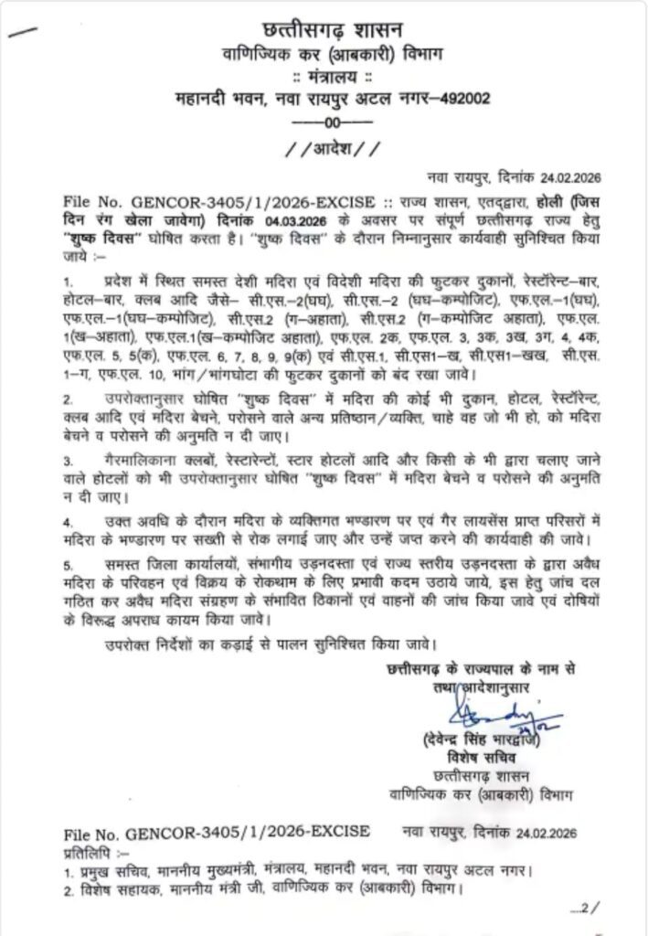 रायपुर। छत्तीसगढ़ में होली के दिन शराब बिक्री को लेकर स्थिति एक बार फिर साफ हो गई है। राज्य सरकार ने होली के मौके पर शराब दुकानों को बंद रखने का निर्णय लिया है। इस संबंध में आबकारी विभाग ने आधिकारिक आदेश जारी कर दिया है।