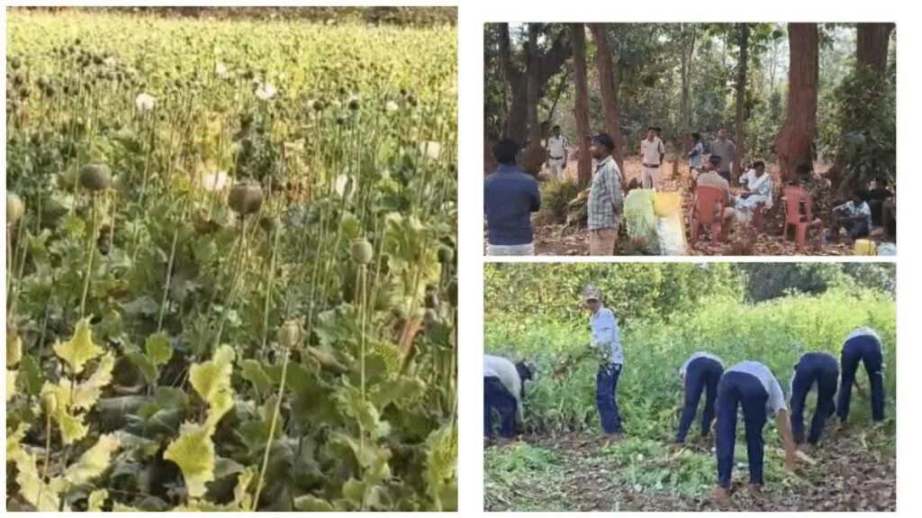 दुर्ग जिले के समोदा और झेनझरी गांव में विनायक ताम्रकार के खेत से करीब 5 एकड़ 62 डिसमिल जमीन पर लगी अफीम की फसल उखाड़ दी गई है। पुलिस ने करीब 62 हजार किलो अफीम के पौधे जब्त किए हैं, जिनकी अनुमानित कीमत लगभग 7 करोड़ 88 लाख रुपए बताई जा रही है।