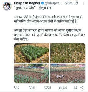 इस मुद्दे पर सियासत भी तेज हो गई है। पूर्व मुख्यमंत्री भूपेश बघेल ने X पर सरकार पर निशाना साधते हुए तंज कसा। उन्होंने कह—“अब तो ऐसा लग रहा है कि भाजपा को अपना चुनाव चिन्ह ‘कमल के फूल’ की जगह ‘अफीम का फूल’ कर लेना चाहिए। प्रदेश में जिस तरह से लगातार अफीम की खेती पकड़ाई जा रही है, वह तथाकथित ‘सुशासन’ की असल तस्वीर दिखा रही है।”