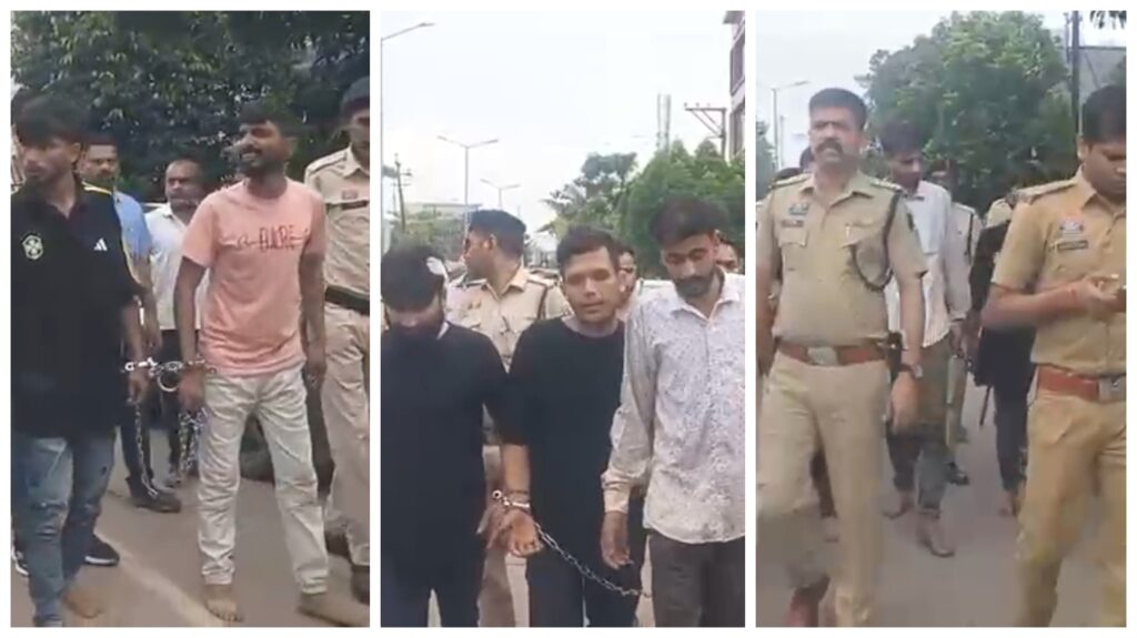 रायपुर। छत्तीसगढ़ की राजधानी रायपुर में हाल ही में हुए गैंगवार प्रकरण के आरोपियों पर पुलिस ने बड़ी कार्रवाई की है। शनिवार को डीडी नगर थाना पुलिस ने पांच आरोपियों को गिरफ्तार कर इलाके में उनका जुलूस निकाला। जिन आरोपियों का जुलूस निकाला गया, उनमें वैभव रागी, ओम दुबे, शुभम मिश्रा समेत अन्य युवक शामिल हैं। पुलिस ने उन्हें घटना स्थल से लेकर थाने तक नारेबाजी कराते हुए जुलूस में शामिल किया। इस दौरान पुलिसकर्मी आरोपियों से “कानून हमारा बाप है, अपराध करना पाप है” जैसे नारे भी बुलवाए।