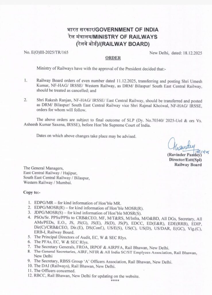 रेलवे बोर्ड द्वारा जारी नए आदेश के तहत उमेश कुमार की बिलासपुर DRM के रूप में की गई पोस्टिंग को रद्द कर दिया गया है। इससे पहले, राजमल खोईवाल के स्थान पर उमेश कुमार को DRM बनाया गया था, लेकिन पारिवारिक कारणों का हवाला देते हुए उन्होंने अपना तबादला निरस्त करने की मांग की थी।