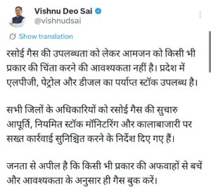 मुख्यमंत्री साय ने सोशल मीडिया प्लेटफॉर्म एक्स पर भी पोस्ट कर कहा कि राज्य में एलपीजी, पेट्रोल और डीजल का पर्याप्त स्टॉक उपलब्ध है। सभी जिलों के अधिकारियों को गैस आपूर्ति की निगरानी करने और किसी भी तरह की कालाबाजारी पर सख्त कार्रवाई करने के निर्देश दिए गए हैं।