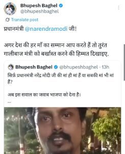 वहीं, पूर्व मुख्यमंत्री भूपेश बघेल ने सोशल मीडिया पर प्रतिक्रिया देते हुए कहा – “क्या सिर्फ प्रधानमंत्री नरेंद्र मोदी जी की मां ही मां हैं या सबकी मां भी मां हैं?” बघेल ने भाजपा पर सवाल खड़े करते हुए मांग की कि मंत्री सार्वजनिक रूप से माफी मांगें और भाजपा तत्काल उनका इस्तीफा ले।