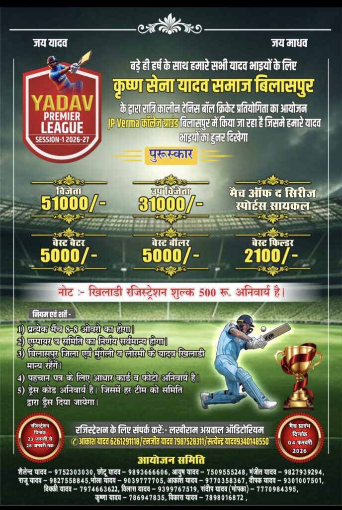बिलासपुर। युवाओं को नशे जैसी सामाजिक बुराइयों से दूर रखकर खेल की दिशा में आगे बढ़ाने के उद्देश्य से यादव समाज द्वारा बिलासपुर में यादव प्रीमियर लीग (YPL) का आयोजन किया जा रहा है। इस लीग का पहला संस्करण समाज के युवाओं को सकारात्मक मंच देने की सोच के साथ शुरू किया जा रहा है।